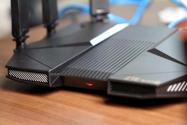 中兴AX5400 Pro路由器整体造型采用对称式设计,中间是一排竖向的栅格,以此为中心,两边对称,这个栅格兼顾造型和散热,左右两翼是凹凸有致的线条分割设计。