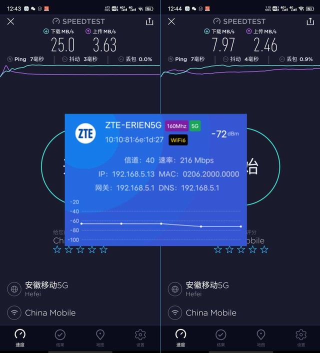 测试点2同样也是隔着一堵墙,测试点距离路由器大概12米左右,关门测试,信号满格,实际测得2.4G频段下载为7.97MB/s,上传2.46MB/s;5G频段下下载为25MB/s,上传3.63MB/s;