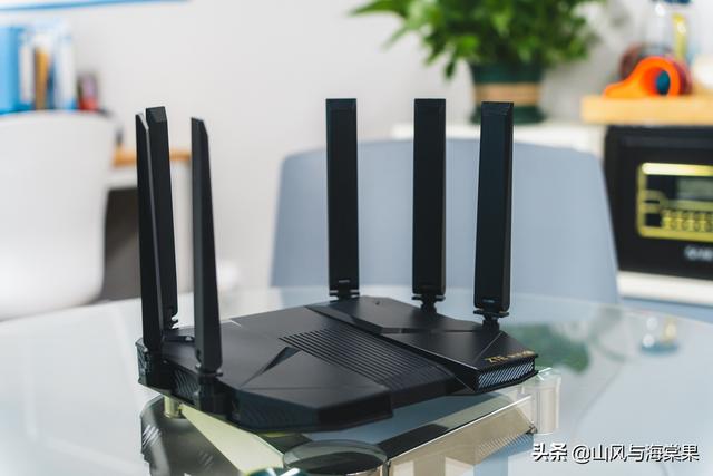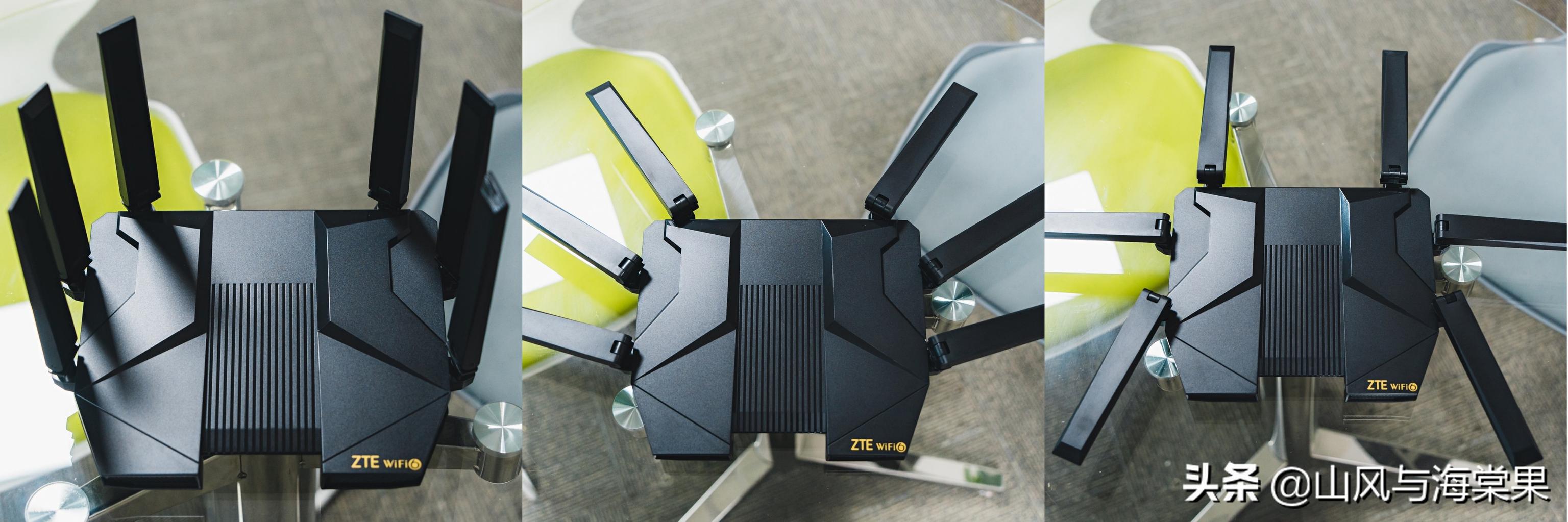 路由器的造型也是我这个颜控眼前一亮,非常前卫,极具科技潮流感。它的天线折叠在盒子里,像一只螃蟹一样。6根天线非常宽,底盘也是不规则的形状,非常有棱角感。