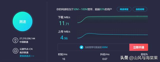 所有设置安排好以后,使用测试软件来看看网速怎么样,我家的网络是50兆的,把路由器放在办公室,平均到每个房间来看,软件测的下载速度是11M以上,上传4-5M/s,相当于100兆的宽带了,可以看出穿墙效果也是很优秀的。