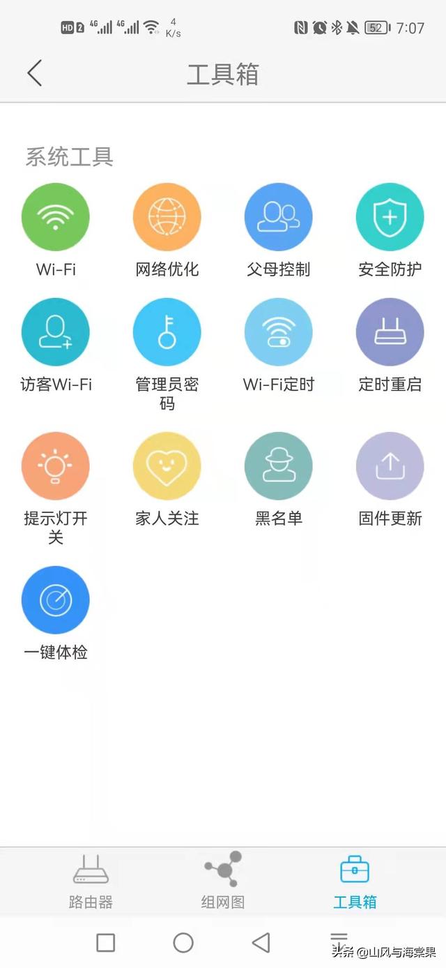第三栏是工具箱,里面的设置非常丰富,一共有十多项,包括网络优化、父母控制、安全控制、WiFi-定时、黑名单、定时重启等等。可以根据自己的需求进行设置。