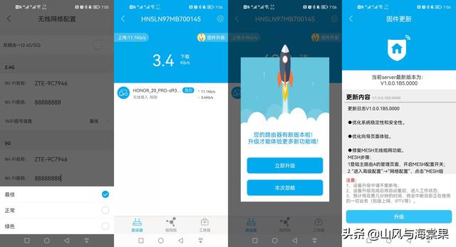 先下载“中兴智能家居APP”对路由器绑定,然后进行系统更新和设置。进入APP的路由器界面,上面显示上传和下载速度,还有连接路由器设备的型号。第二栏是组网图,有互联网到连接路由器的设备,非常丰富地显示出网络。
