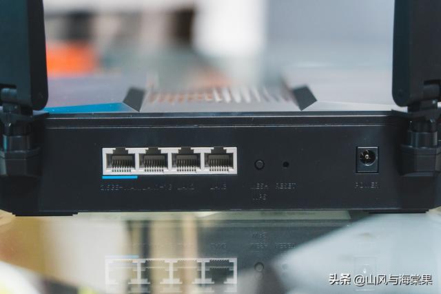 产品背面是标配的4个网线口,从左到右依次是WAN接口,和三个LAN接口。再往右是MESH/WPS键,用来给路由器快速组网的。RESET 孔是重置按键,用来复位路由器,恢复出厂设置的。