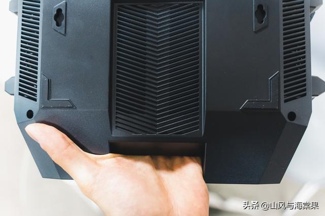 路由器底部也是防滑橡胶脚垫,预留了壁挂螺丝孔,可以挂在墙上使用。底部、侧面依然也有很多散热格栅,加大了散热的性能。官方给出的数据是40000小时连续使用如新。这还是相当给力的。