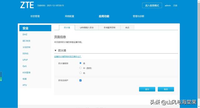 如果想要进行复杂的设置,可以选择高级模式,需要更专业的人员才能好设置。里面包括状态设置、网络配置、应用功能、管理诊断等,可以进行MESH组网、防火墙、DHCP、DDNS 等设置。