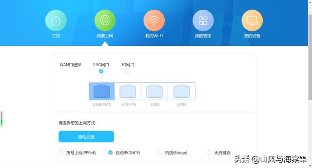 另外,也可以登陆电脑后台使用PC端进行设置,先进入简单模式,和手机上的选项差不多。第一次登录中兴ZTE AX5400 Pro路由器会建议选择桥接,PPPOE还是,无线链路,是否开启MESH选项等,如果不会选择,可以进行自动检测。其他的还包括,我的WiFi,我的管理,我的设备等基础的一些配置。