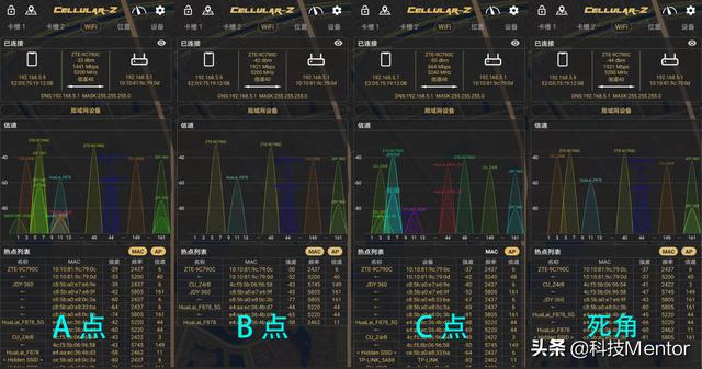 首先我们先在A、B、C与死角四个点测了下路由器信道,通过信道图我们能够看到A点与B点的信道最好,基本围绕在-30 dbm与-40 dbm之间。可能是由于墙面较多的原因,C点的信道与死角的信道基本差不多,围绕在-50 dbm与-55 dbm之间,不过死角有小概率会飙升到-60 dbm,通过信道来看中兴AX5400 Pro基本已经实现了全屋网络覆盖。