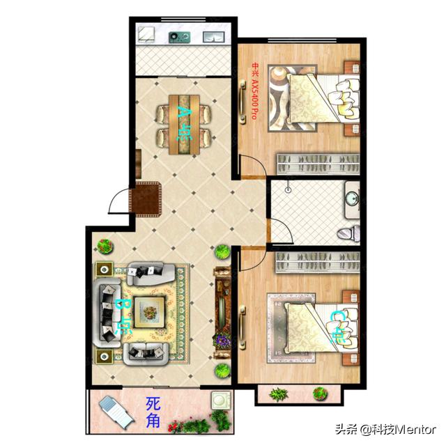 当然,自研芯片厉害不厉害,还要看实测,一切理论都是空谈,数据不说谎。上图为目前家里的户型图,单层两室一厅,面积为123㎡,由于房屋比较老,当时装修时网线接口设计在了次卧,也正因此南面的阳台成为了家里的死角地带,试过很多路由器,在阳台使用基本都没有什么信号,或者信号弱不稳定,哪怕是刷视频都没法流畅播放。此次测试,将会围绕A点、B点、C点、与死角4个点进行。