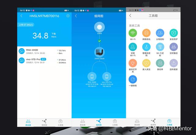 中兴AX5400 Pro还可以通过‘中兴智能家居’APP进行设定,如果初次使用时也会有一个引导界面帮助我们联网。将路由器与‘中兴智能家居’APP进行绑定后,我们还可以对路由器进行一些设置,如:路由器灯光开/关、访客WIFI、定时重启、黑名单等。如果家中户型较大那么可以买两台中兴AX5400 Pro,通过MESH组网,让大户型实现全覆盖,而且‘中兴智能家居’APP也会有组网图,连接的路由器、组网路由、连接设备等都有显示,清晰的组网图能够让用户一目了然的了解路由器的组网状态。