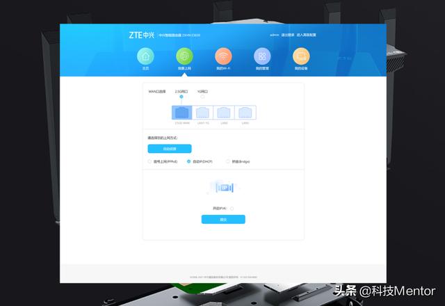 至于路由器的连接方式,包装盒上写的很详细,这里就不过多阐述了。另外,路由器连接完毕后,我们只需在PC网页输入192.168.5.1或 zte.home便可进入中兴AX5400 Pro的WEB管理界面进行上网设置,整个设置过程会有一个引导界面,我们根据自己的实际情况进行选择即可,体验一番还是非常简单,即使小白操作也没难度。另外,中兴AX5400 Pro的WEB管理界面可以在简洁模式与高级模式之间切换,无论是对新手小白还是熟悉路由的老手都非常友好。