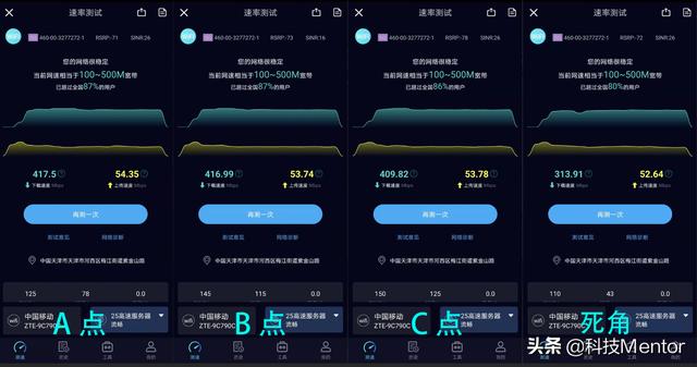 测完信道后,开始测4个点的网速,不过此次的网速测试结果还是挺出乎意料的。首先便是4个点的上传速度基本相差无几,全部保持在了50Mbps以上,A点可能是因为路由器进,上传速度最好,达到了54.35Mbps,而死角阳台的上传速度也达到了52.64Mbps,上传速度4点较为平稳。而下载速度的差距就有些大了,A、B、C三点均保持在了400Mbps以上,而死角的阳台仅为313.91Mbps。
