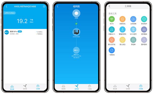 绑定成功后,可以看到中兴AX5400 Pro路由器在APP主界面比较简单。主要由三大部分功能模块:路由器、组网图、 工具箱。【路由器】就是可以实时了解连接路由器的设备列表,以及显示当前设备上传和下载速度。【组网图】是以图形的方式,为我们展示联网设备的情况。【工具箱】里面的功能相对还是比较丰富一些,有WIFI、网络优化、父母监控、安全防护、访客WIFI、管理员密码、WIFI定时、定时重启、提示灯开关、家人关注、固件升级以及一键体验。都是一些比较基本实用的功能,可以通过远程进行设置,非常的方便。