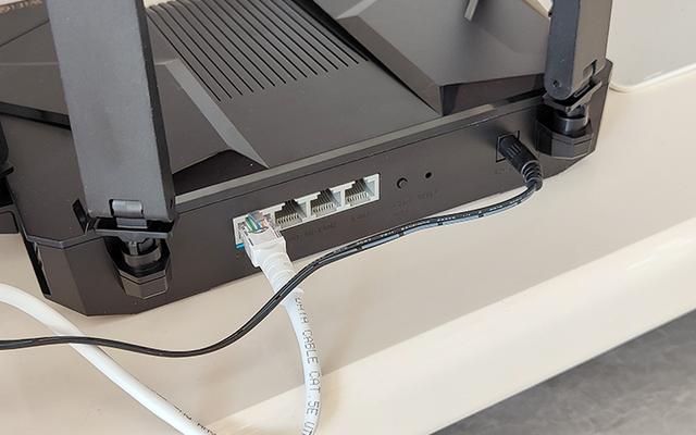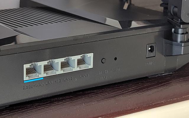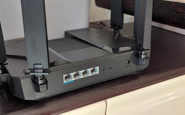 最后,再来看看AX5400 Pro路由器的机身尾部。从左到右分别是:一个2.5GE网口、三个LAN网口、一个WPS按键、一个RESET按键以及一个电源接口。这款路由器在网口部分最大亮点之一,就是拥有真2500M自定义网口,可以支持2500M宽度,满足对于未来宽带的升级需求。