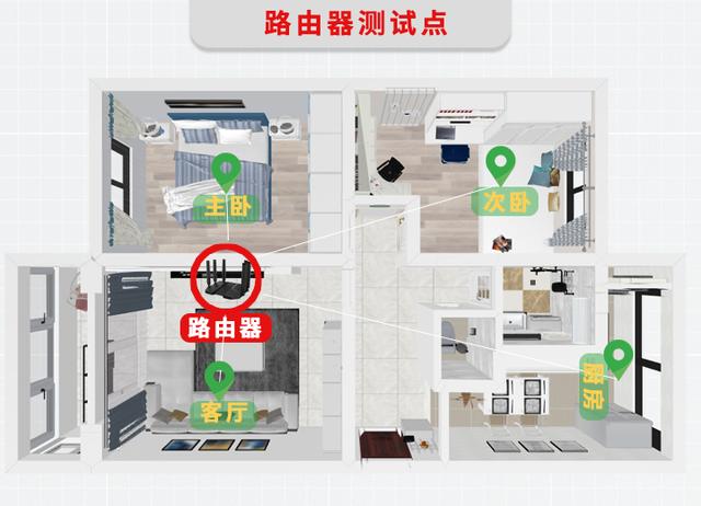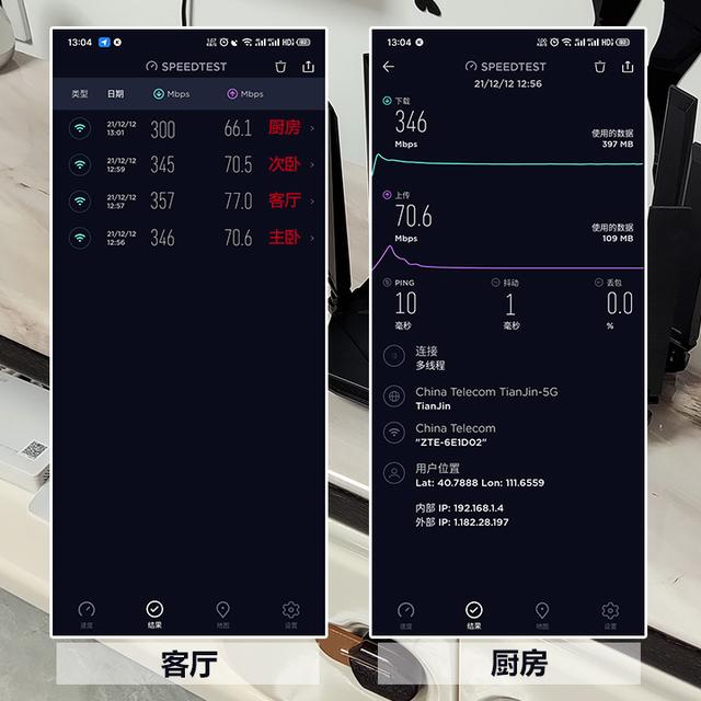搭载6路独立外置信号放大器,可以将信号增强6dB,同时覆盖面也提升50%,不论是信号还穿墙能力都显著提升,100㎡以上大户型都能轻松胜任。而且,这款路由器还支持一键MESH组网,对于大户型家庭来说,可以实现WIFI全屋无死角覆盖,无感智能切换不掉线的体验。不过,对于我家100㎡户型用户来说,就用不着了。下面我通过家中4个不同点儿,进行了实际网速测试,测速软件为“SPEEDTEST”。