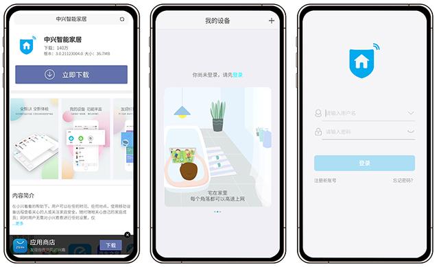 首先,通过扫码下载“中兴智能家居APP”,然后进行设备添加,根据向导进行注册登录账号进行绑定即可。