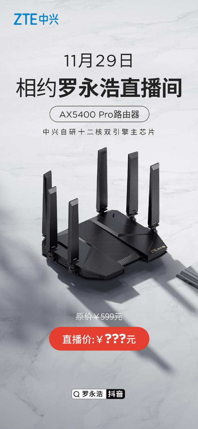 11月29日消息,今天中兴手机官方微博发文确认在今晚的罗永浩直播间,中兴AX5400 Pro路由器将会以惊喜价的方式开售。