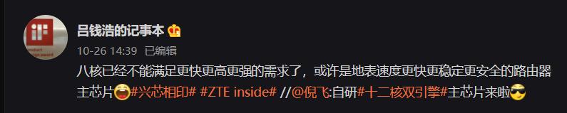此前,中兴推出的AX1800、E508、ZXHN E2618等都采用自研芯片。相比之下,中兴通讯吕钱浩微博表示,八核已经不能满足更快更高更强的需求了,这或许是地表速度更快更稳定更安全的路由器主芯片。
