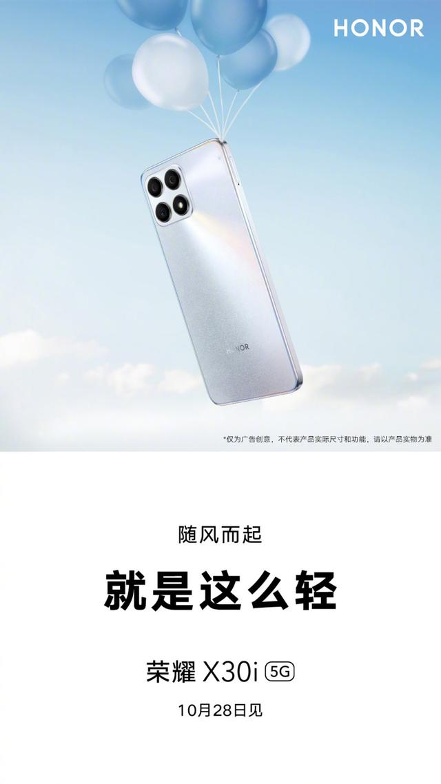 今天上午,荣耀手机官方宣布,将于10月28日发布旗下新机荣耀X30i,主打轻薄机身设计,并放出三张宣传海报。