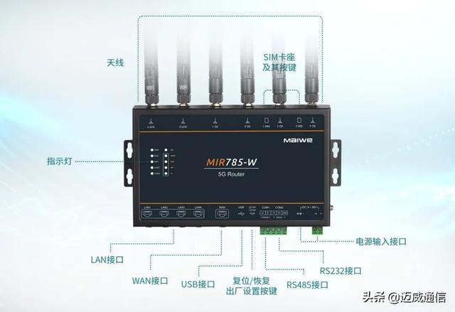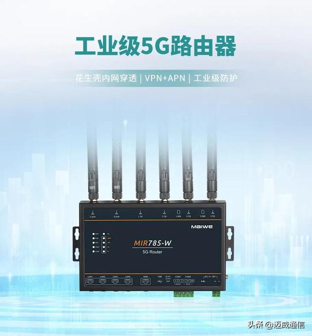 MIR785-W是迈威通信新推出的一款双频千兆WiFi 6工业级5G路由器,双频并发速率高达1775Mbps,无线速率更快,传输距离更远,并且支持NSA和SA双模5G网络,支持一路RS485和一路RS232接口和5个千兆以太网接口,可以实现RS485和RS232、蜂窝数据以及以太网之间相互透传功能;为用户设备提供了一种便捷快速的联网方案,是工业网络的首选设备。