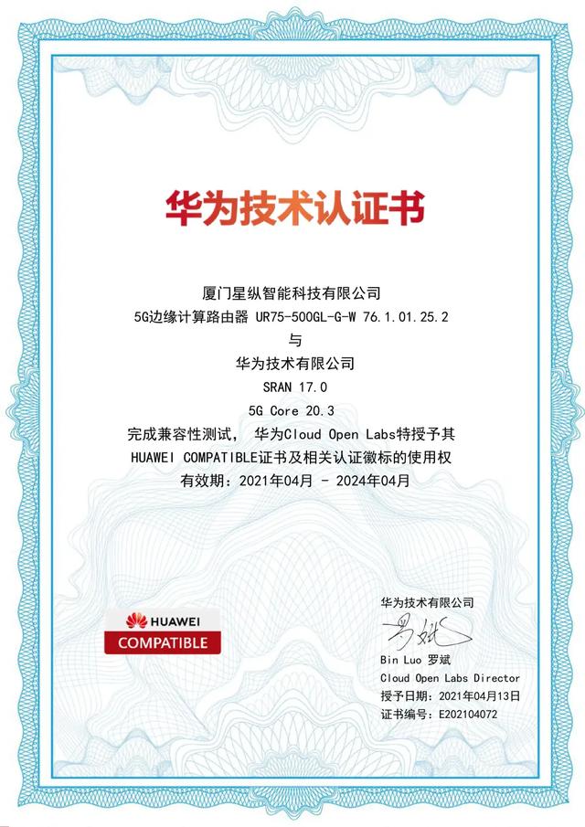 近期,经过华为OpenLab全球开放实验室的系列严格验证流程,星纵智能5G边缘计算路由器完成华为兼容性测试,获得华为Cloud Open Labs授予的HUAWEI COMPATIBLE证书及其相关认证徽标使用权。