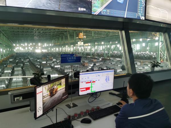 宝钢员工在控制室内观察无人仓库和无人运输车运营状况。