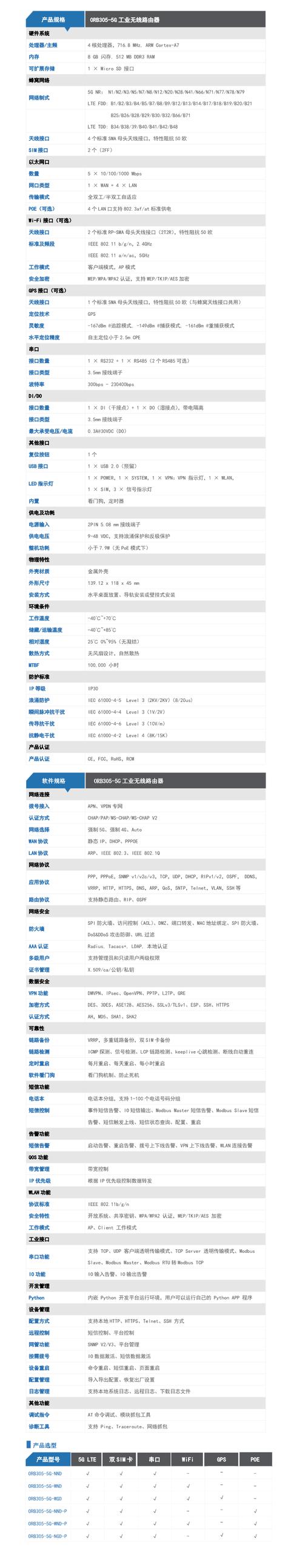 说了这么多,给大家看一些参数参考吧,以ORB305-5G工业级路由器举例,详细参数如下图