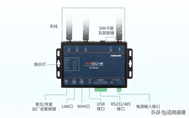 为了满足多样化的市场需求,近期,迈威通信重磅推出了一款双网口工业4G路由器MIR652-W,它支持一路RS232/485接口和两路以太网接口,可以实现RS232/485、蜂窝数据以及以太网之间相互透传功能,双卡单待。