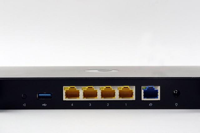 接口集中设置在了路由器的背面,首先是一个复位按键,随后分别有一个多功能USB3.0接口、四个千兆LAN口、一个千兆WAN口、电源接口。多功能的USB接口可以接入NAS或者硬盘打造私有云,这样便可远程存储文件,此外还支持3G/4G USB适配器上网。