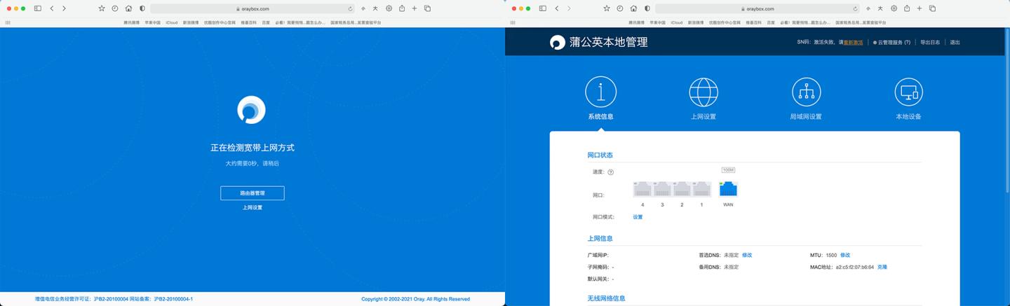 实际上进入该网站后,有路由器管理和上网设置两选择。蒲公英本地管理包括有系统信息、上网设置、局域网设置以及本地设备。