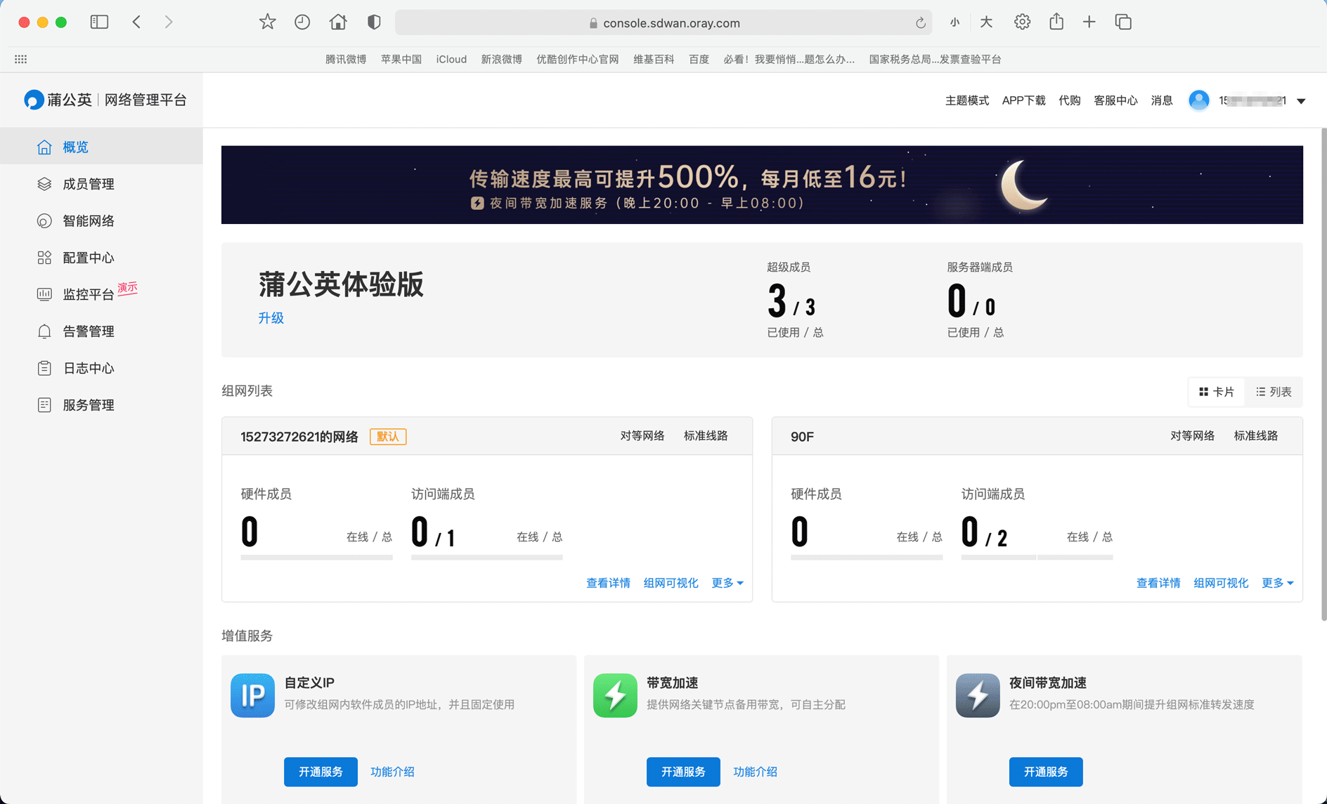网络管理平台分有概览、成员管理、智能网络、配置中心、监控平台、告警管理、日志中心、服务管理。
