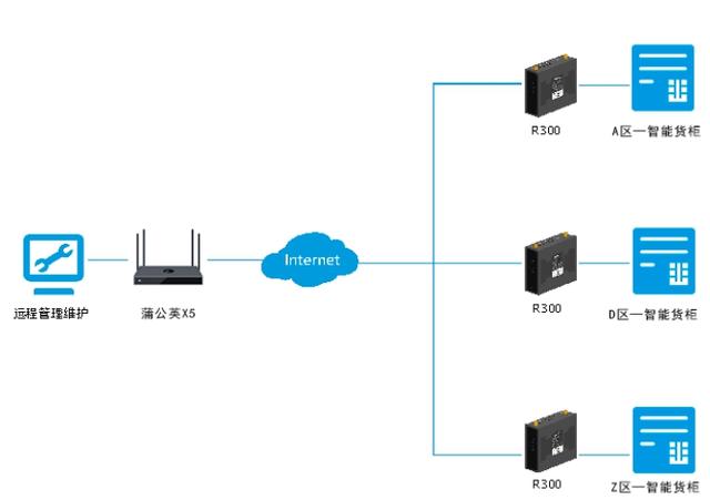 由下方可以看到,R300连接智能货柜,而另外一个硬件是远程运维电脑下的蒲公英X5路由器,组网后产生的业务数据通过专用的VPN通道传统到运维中心的服务器端,实现服务器对分布在各地的智能货柜进行集中监测、配置、升级和诊断等。