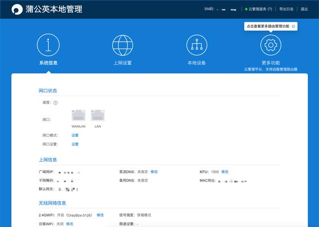 接下来就是进入蒲公英路由器的管理界面了,这里可以看到路由器的一些信息。