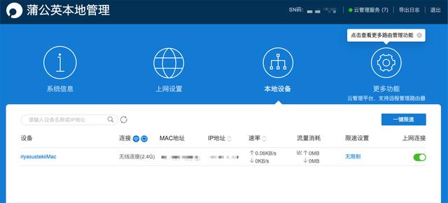 本地设备则可以看到当前网络下链接的设备,目前我只接入了我的电脑来测试速度。而最关键的则是最后一个选项,也就是更多功能。
