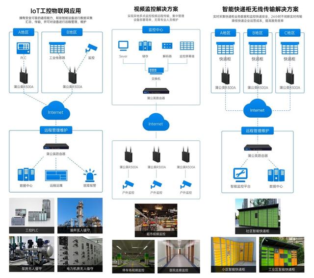 工业路由器和家用路由器有一个不同的是:它需要配置多台才能发挥真正作用。例如若干台蒲公英R300A就能为企业、工厂提供网络解决方案,甚至能给IOT物联网行业(IT、石油、电力自动化)提供解决方案,使用场景可以见下图。当然,由于它皮实耐造且支持4G,个人认为在农村、牧场、偏远山区当做家用也没问题。