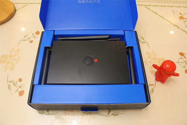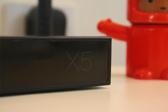 前侧为玻璃显示面板,其左侧为指示灯,可通过指示灯绿、红、蓝三色的常亮和闪烁来表示不同工作情况,让用户对路由器状态一目了然,右侧印有X5的型号标识,颇显低调内敛气质。
