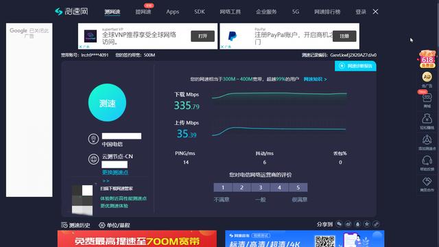 而作为WiFi6路由器,蒲公英X5理论可带机100台,双频并发速率提升至1800Mbps,要真正了解X5的使用效果,不实测怎么可以。先测电脑有线直连,测得下载/上传分别为335.79Mbps/35.39Mbps,与我家500M宽带的速度相符。