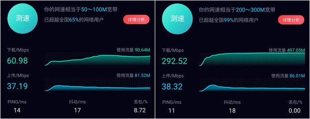 而使用手机分别连接2.4GHz和5GHz无线网络,测得下载/上传分别为60.98Mbps/37.19Mbps和292.52Mbps/38.32Mbps,比起办理宽带时电信赠送的某兴路由,强了不是一点半点,而且运行也很稳定,目前没出现什么状态,个人还是比较满意的。