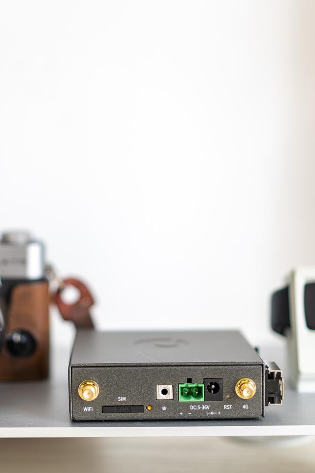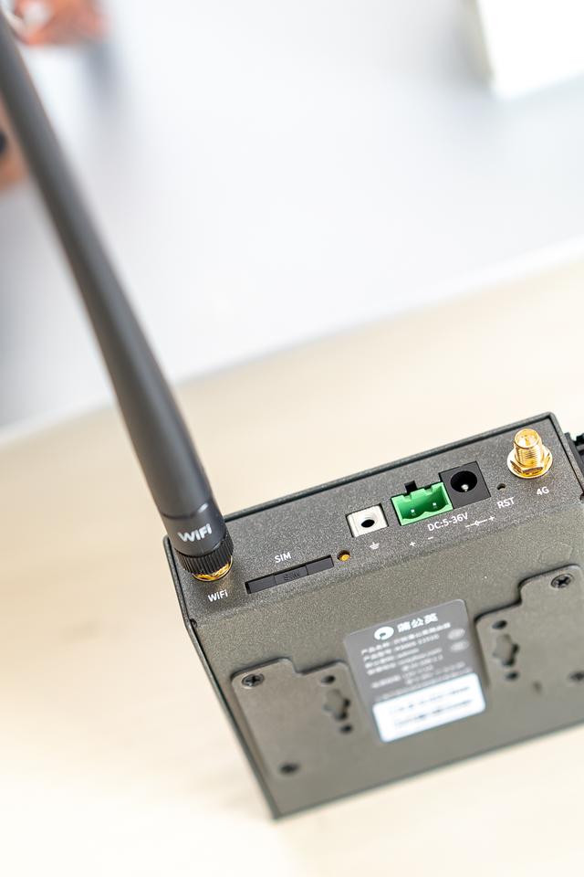 正面这里的接口就有些特别了,与常见的家用无线路由器不太一样,有专用于接地线的地线接口,还有宽电压设计的供电端子,以及用于4G上网的SIM卡槽。由于工业自动化的设备电源没有家用电器那么稳定,出于对设备稳定性的要求,配备宽电压设计的供电端子是十分有必要的,在有工业电源的机柜里也能增加稳定性,减少接头脱落的风险。