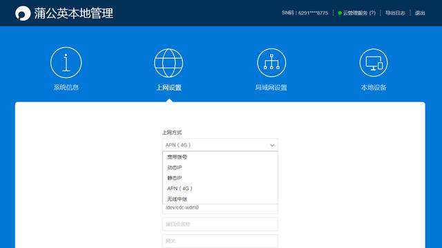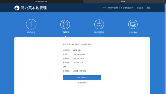 由于支持多种联网方式,所以蒲公英R300S也能够智能地进行网络切换,插着网线的话会优先启用有线网线的资源,一旦有线网络断开,就会自动开启4G上网,当然你也可以在上网方式这里进行手动选择。