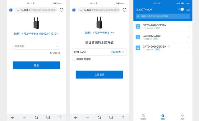 通过浏览器输入10.168.1.1或者oraybox.com,即可进入蒲公英本地管理界面,首次需要绑定产品的SN码,然后登录输入初始密码:admin,登录之后就可以看到主界面了。在设置网络时,因为路由器支持4G网卡、WAN口接网、无线中继上网三种连接方式,所以设置上网的方式还是很丰富的,如果在没有网络的连接下,可以直接选择4G模式上网,前提是装了物联网卡或流量卡。当然,也可以不使用4G物联网卡,当普通家用路由器也是可以的,两个接口也够日常使用了。