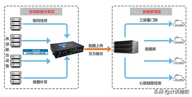 支持断电、断网续传和数据自动补发,保证数据完整性;有线、无线网络互为备份,降低通信故障概率;三级看门狗机制、心跳链路监测保护,保障数据稳定完整传输。