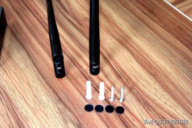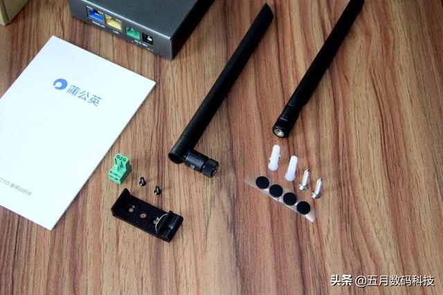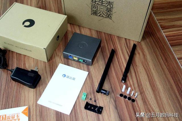 让我们先看一下全家福,然后再进行设备的组装。机身,电源适配器,2根外置天线装置,还有中国联通SIM卡,4个小的膨胀螺栓和4颗螺丝刀,说明书、悬挂装置、4个脚垫,蒲公英想的还是很周全的。