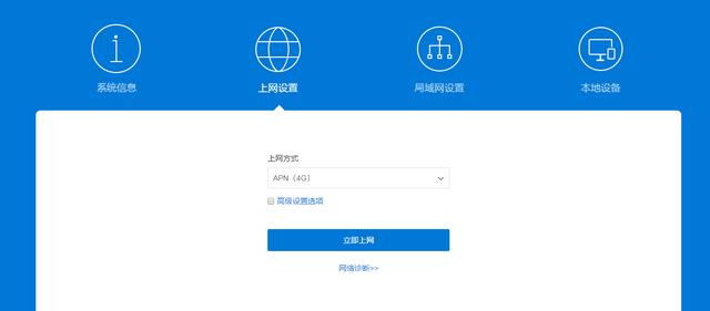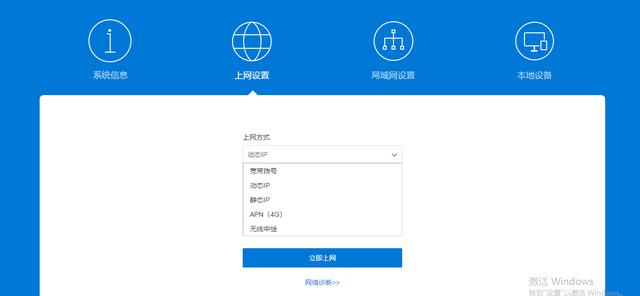 进入蒲公英本地管理页面,我们可以看到,系统给到了宽带拨号、动态IP、静态IP、APN(4G)和无线中继(连接附近WIFI接入)5种上网方式,大家可以根据需求,选择不同的模式。