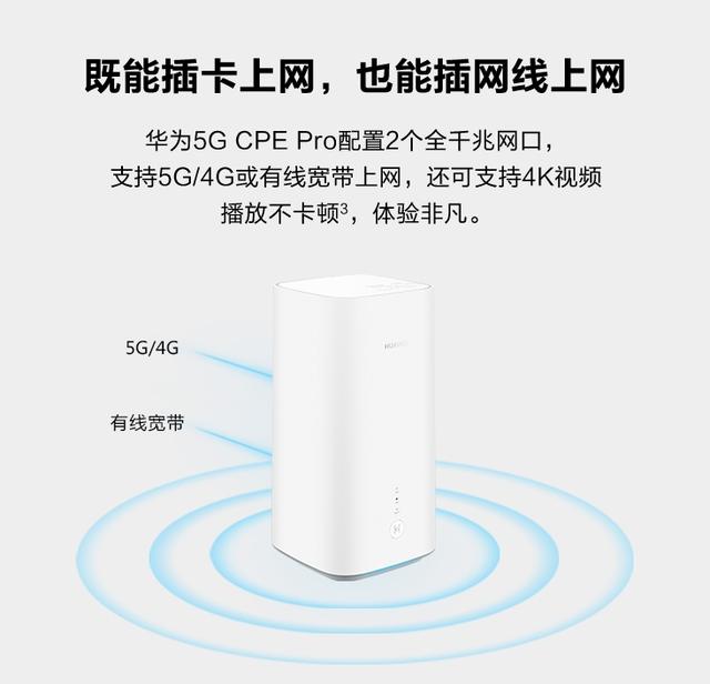 虽然是移动路由产品,但是华为5G CPE Pro配备了两个千兆网口,除了插SIM卡,同样可以连接有线宽带使用,也就是当出差的时候,进入酒店的时候,如果酒店有提供高速有线网络,那么华为5G CPE Pro也可以将酒店的有线网络分享出来,并且信号要比酒店的WiFi信号更好。因为它作为一款路由产品,华为5G CPE Pro采用了全频段4.9dBi高增益的仿生蝶式双极化巴伦天线,确保用户路由器拥有最大化的WiFi信号覆盖面积且速度更快。