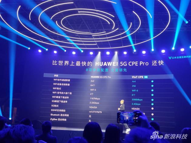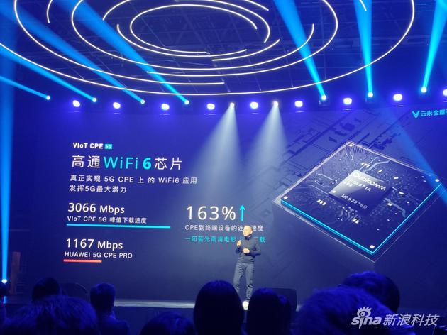 云米科技创始人陈小平首先介绍了云米5G VIoT CPE。它基于高通X55基带芯片,支持SA/NSA双组网,下行速度理论值能够达到3.4Gbps,据云米称高于华为5G CPE Pro的2.33Gbps。