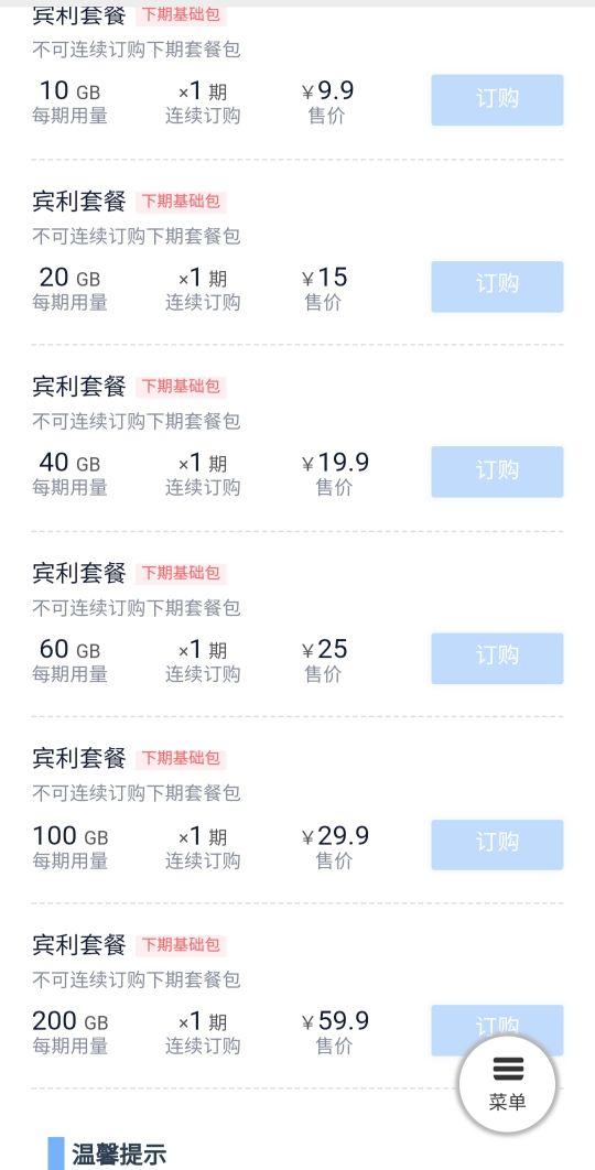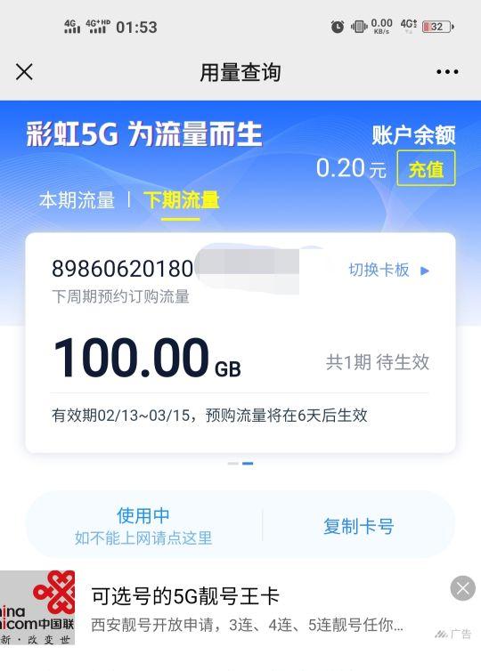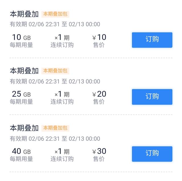 等了几天,第二张卡到了,激活之后,之前那张不能用的卡上的流量也给我补过来了,第一次花9.9元买了10G,用着感觉还行,后面又补了20块买了25G。这个是每个月第一次订购优惠力度大,叠加包就比较贵了。