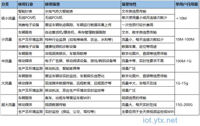 在物联网行业里,卡流量可分为大流量(≥1024M)、中流量(150-1024M)、小流量(10-100M)。一般来说,物联网流量需求的大小与行业和设备有关: