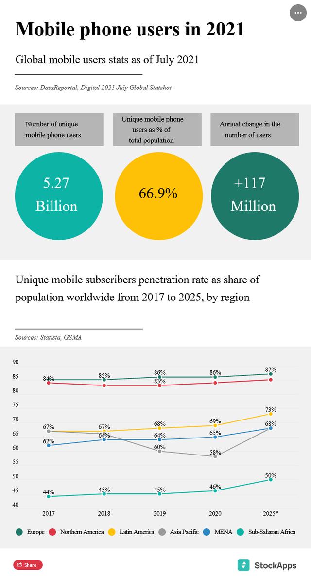 根据Stock Apps的数据,全球67%的人口,也就是约53亿人在7月份时至少拥有一部手机。与去年7月相比,这意味着1.17亿新用户。当然,这在全球范围内的分布并不均匀:例如,欧洲是去年的领先地区,其86%的人口拥有手机。然而,这个市场基本上已经饱和,因为对2025年的预测是87%,所以在未来几年几乎没有任何增长。