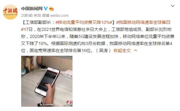 #我国移动网络速率全球第四#17日,在2021世界电信和信息社会日大会上,工信部党组成员、副部长刘烈宏称,2020年下半年以来,随着5G建设发展进程加快,移动网络单位流量平均资费又下降了10%。根据国际测速机构3月份数据,我国移动网络速率在全球排名第4位,固定宽带速率在全球排名第16位。(吴涛)