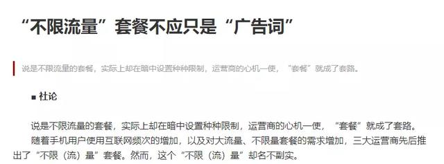 就在昨天,根据新京报报道,中国移动公司下发通知:“要求在大流量资费产品中停止‘不限量’传播,同时将各类线上线下广告、自有渠道、营销活动中含有‘不限量’内容的宣传下线;另外,对已经发布的含有‘不限量’内容的宣传物料进行撤换。所有档位套餐,均需在广告画面中标注‘流量畅享,达量降速’的提示。”